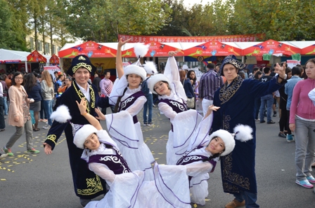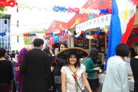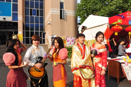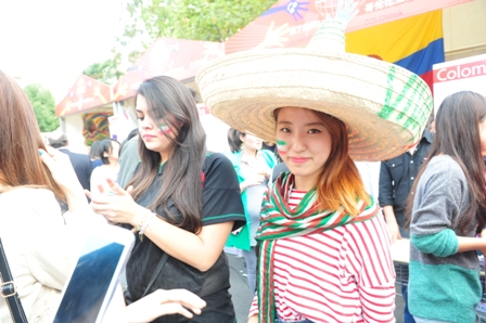 当日下午,33个国家的留学生在延安路校区新世纪餐厅广场举行的文化风情展吸引了上千名中外学生。越南学生在展台前立起漂亮的门楼;墨西哥“名厨”现场烹制地道的民族美食;巴基斯坦学生现场展示本国特色艺术——纹身画;韩国学生表演传统的“四物农乐”;中国学生的舞龙表演、传统游戏更是引来阵阵喝彩。各国的特色美食让大家一饱口福,穿着各国传统服饰的留学生引得大家驻足合影,独具民族风情的舞蹈和音乐,使得现场气氛高潮迭起。