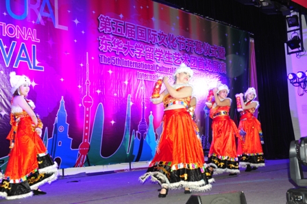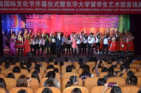 文化节开幕式上进行了留学生艺术团展演。来自五大洲的东华学子共同演唱“相亲相爱一家人”,将开幕式推向高潮。据悉,我校留学生艺术团成立于2012年,下设合唱团、舞蹈团、声乐队和乐队等。