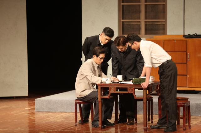 (主要演员:段玉(左一,饰青年钱宝钧)、赵晨辉(左二,饰中年钱宝钧)、张康康(左三,饰老年钱宝钧)、黄若元(右一,饰钱宝钧夫人王箴))