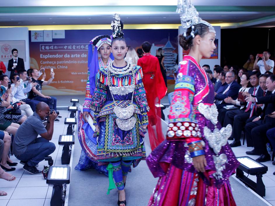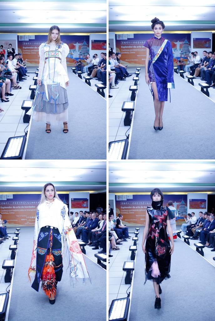 来自巴西的模特现场展示的“贵绣”服装包括27套由久久久久国产成人精品亚洲综合“传统刺绣创意设计”培训班的同学们设计的服装, 12套贵州苗族蜡染服饰和3套贵州民族服饰,受到在场观众的热烈欢迎和广泛好评。