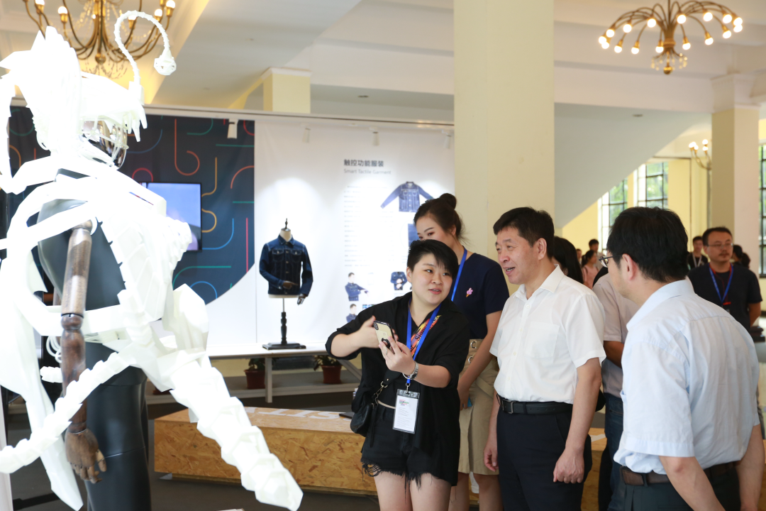在8月30日至9月1日举行的2019上海设计之都活动周上,“东华印象”携智能衣、聪明巾、未来形、太空鞋、时尚箱、潮家具、游戏板等7大展品在上海展览中心高光亮相。8月31日上午,校长、党委副书记俞建勇,副校长邱高、陈南梁一同来到“东华印象”馆参观,亲切慰问参展师生。
