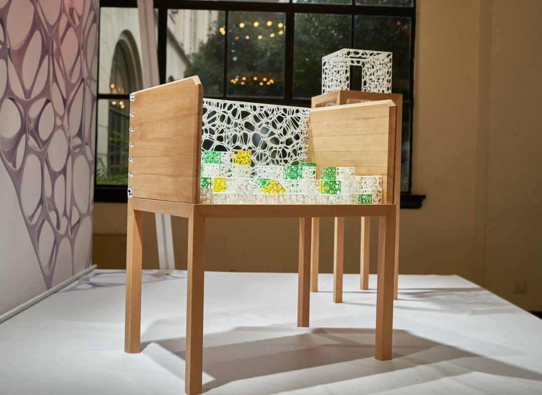 展厅内白色的“维度图腾”夺人眼球,服装与艺术设计学院2019届艺术设计硕士生孙晔、在读硕士生苗雨鑫通过3D服装设计表达对华夏龙的印象,作品给人以纯洁、高贵、空灵之感;“无界”概念家具出自产品设计系副主任余继宏副教授团队之手,巧妙结合白绿黄时尚色彩、3D打印技术与中国传统木作榫卯结构,传递出材质无界、传统与未来的无界之感。