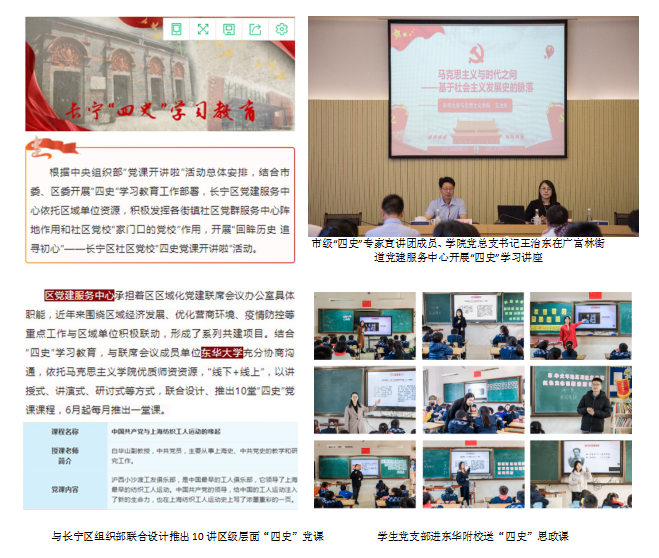 “在‘四史’学习教育中如何发挥高校教师专业科研优势?”“如何将高校党建服务到区域化党建联建共享中?”马克思主义学院党总支依托学院师资、学科和平台等优势,与长宁区委组织部、松江区委组织部、长宁区党建服务中心、松江区广富林街道党建服务中心、长宁区教育局、松江区教育局等区域内多家单位互联互通、共建共享,同绘区域化党建“同心圆”,助力城市基层党建。