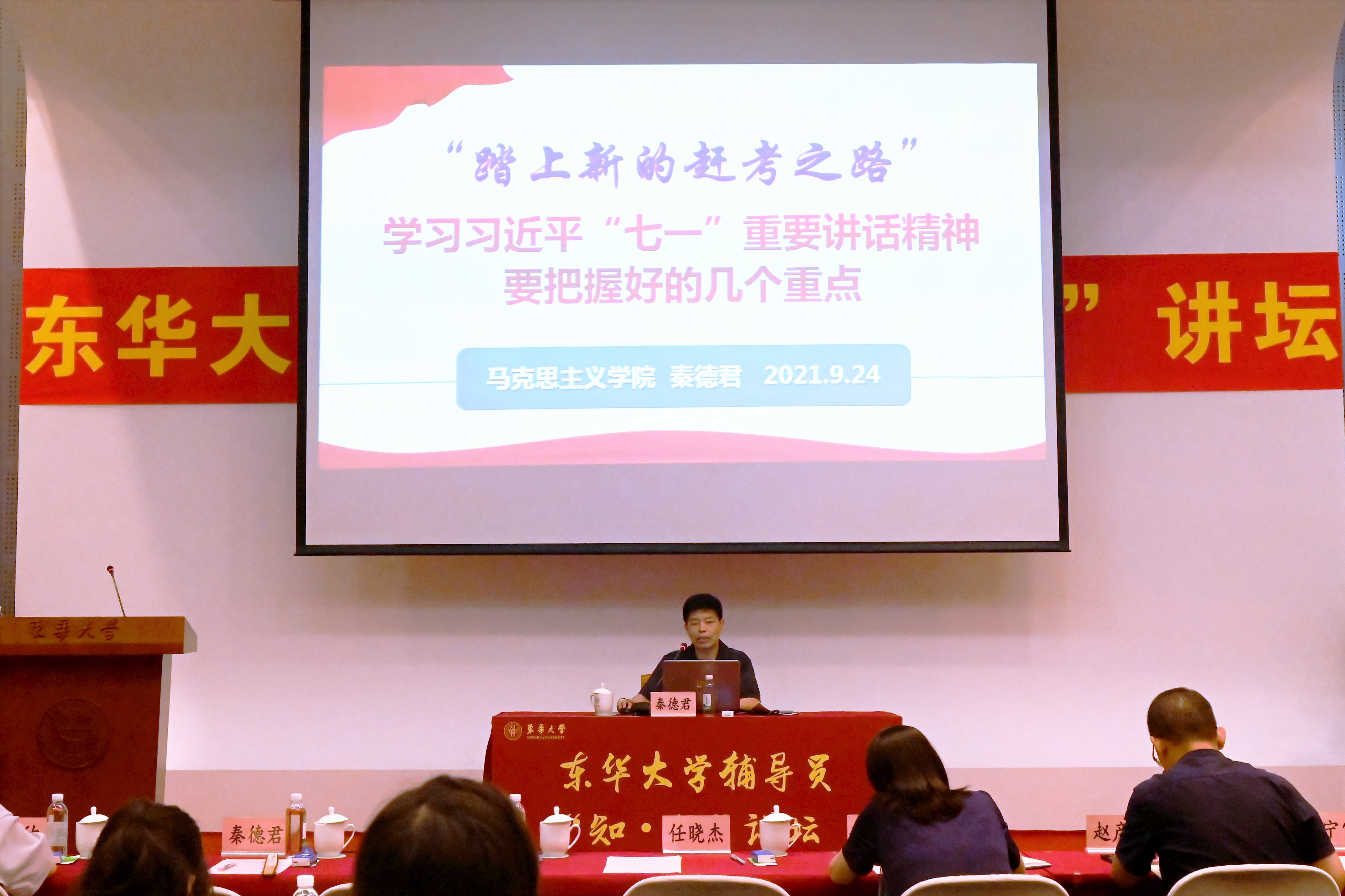 启动仪式后,马克思主义学院秦德君教授带来首讲报告——《“踏上新的赶考之路”——学习习近平“七一”重要讲话精神要把握好的几个重点》专题辅导报告。他从习近平总书记“七·一”重要讲话的思想价值与学习重点、“新赶考”的辩证关系和历史意义、学习七一重要讲话重在推动工作等3个方面对习近平总书记“七一”重要讲话精神进行深入阐释,并就学生思想政治教育工作应该如何贯彻落实好习近平总书记“七一”重要讲话精神作了解读和分享。随后,校心理健康教育与咨询中心副主任田园做题为《辅导员心理危机干预及医教结合工作贴士》的专题讲座,从工作实务角度为辅导员如何运用心理学专业知识,处置学生心理危机事件开展了专业辅导。