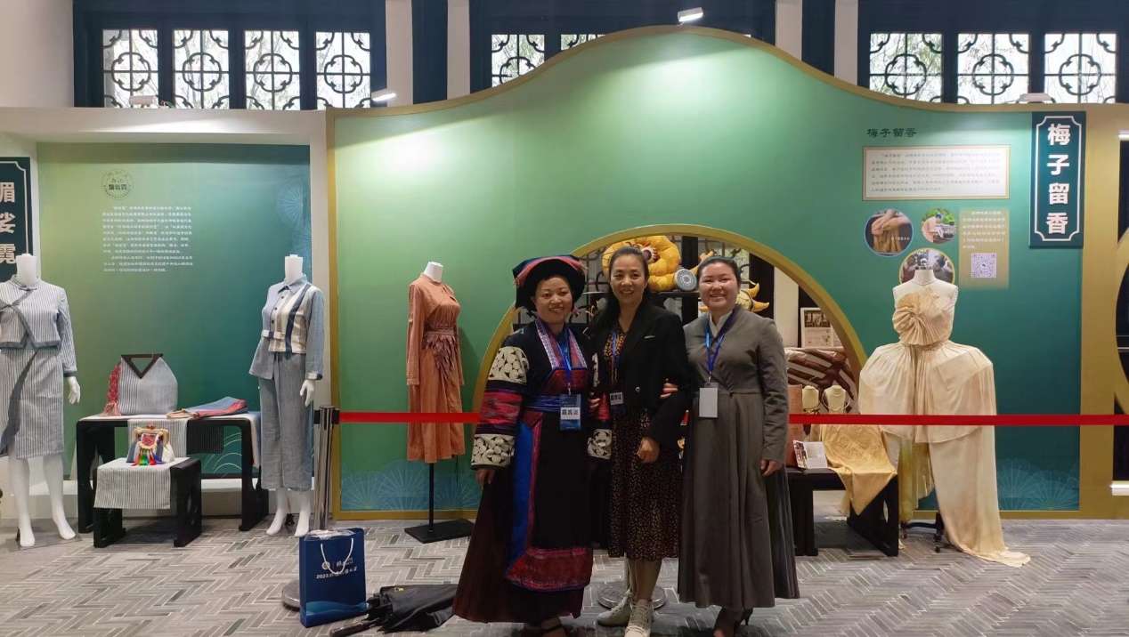 展览现场,一位广东本地客家山歌传承人被秀丽作品优雅的蓝色深深吸引,希望为自己的客家山歌设计团队服装,专程到现场助阵的笔者马上给她们牵线。